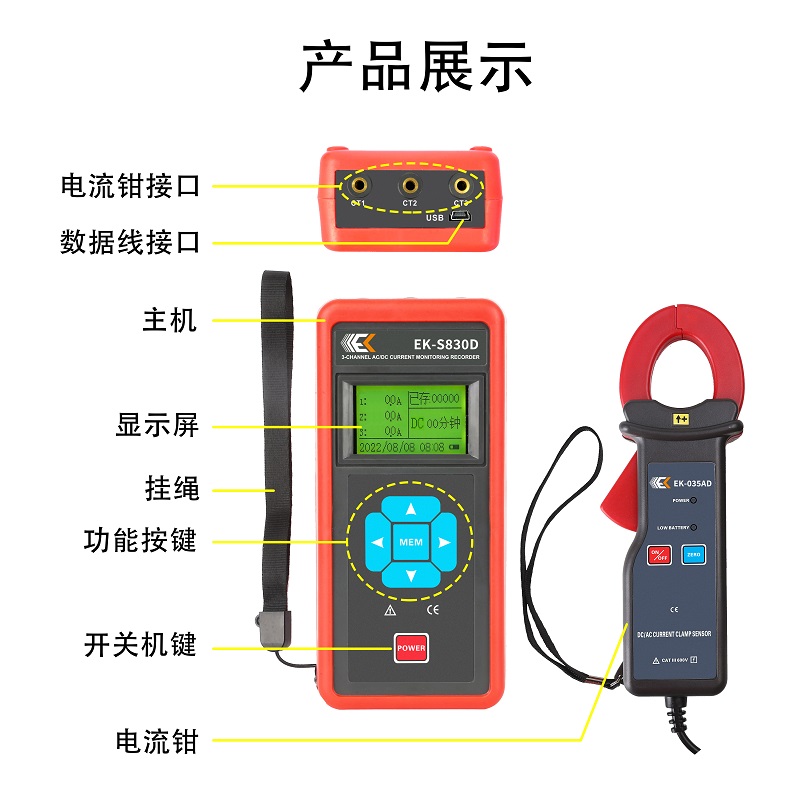 电流钳采用磁屏蔽及数字集成技术,抗干扰强,精度高。主机可配置1至3个电流钳,用户根据需求选型。