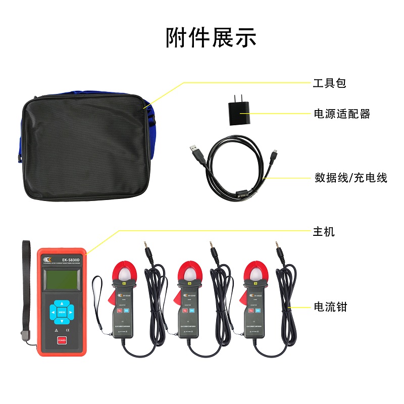 随机附件 | 主机:1件;电流钳:1~3件;USB通讯线/充电线:1个;电源适配器:1件;工具包:1件 |