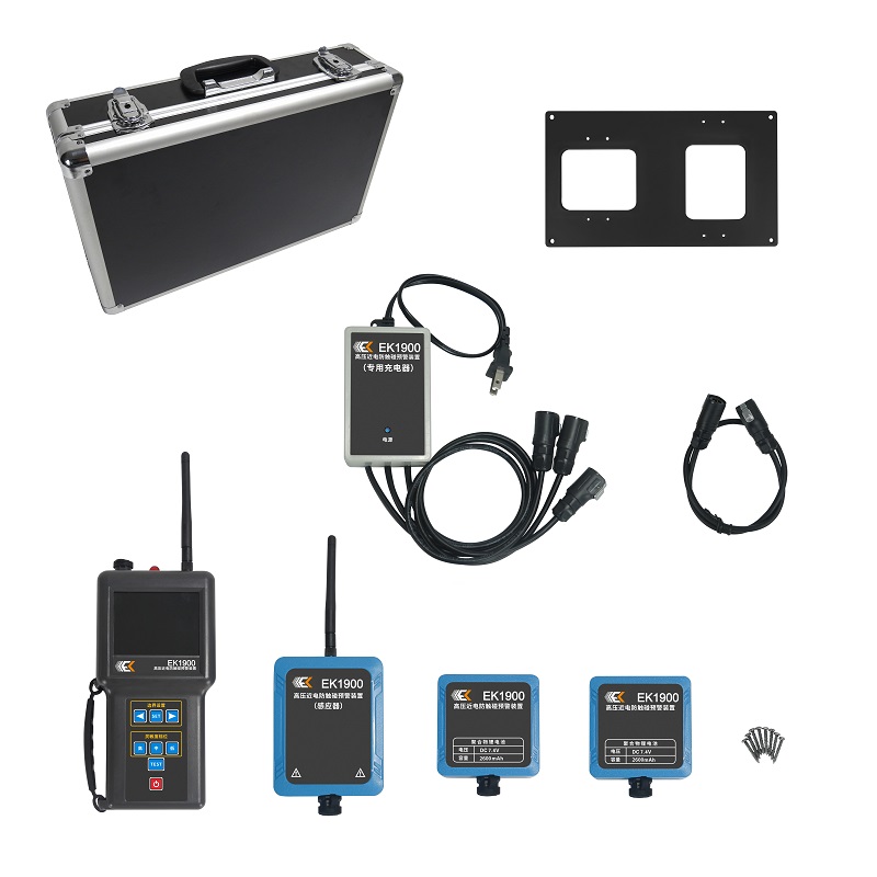 高压近电防触碰智能预警装置由感应器、外置电池、接收器、充电器、蓝牙组成。感应器、外置电池背面有磁铁可吸附在吊臂前端,也可通过背板,安装在绝缘斗上。